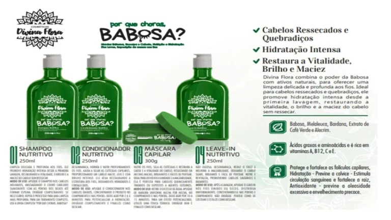 Transforme os seus cabelos com o nosso KIT NUTRITIVO POR QUE CHORAS BABOSA. Este conjunto completo inclui um shampoo, condicionador, leave-in e máscara, todos formulados com a poderosa babosa para proporcionar hidratação intensa e brilho duradouro.